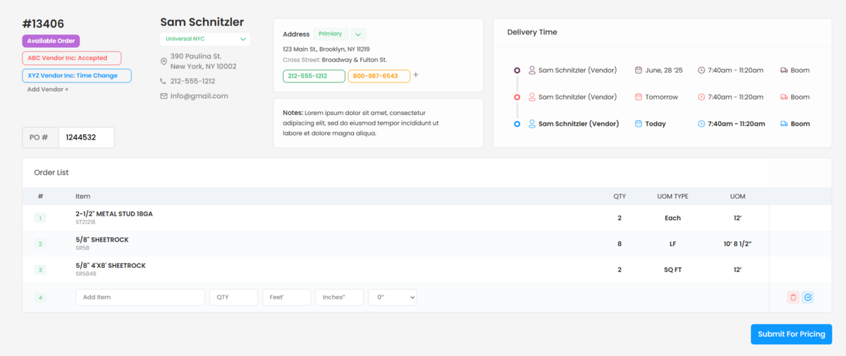 You send the same order to one or two vendors by phone, text, or email.